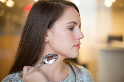 Lật ngược chiếc thìa lại sau đó để chống vào cằm miết đều từ cằm lên thái dương và làm ngược lại liên tục trong 20 – 30 phút .