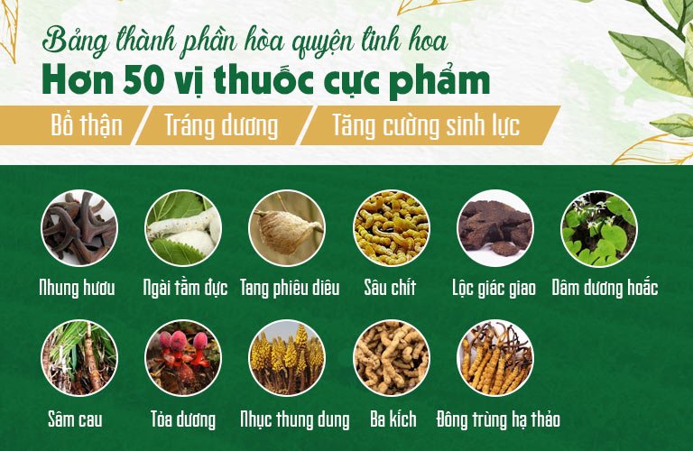 Bài thuốc hòa quyện hơn 50 thảo dược quý tốt bậc nhất trong việc bổ thận, tráng dương, nâng cao sức khỏe như: Đông trùng hạ thảo, Nhung hươu Siberia, Tang phiêu tiêu, Dâm dương hoắc, Sâm cau, Nấm ngọc cẩu, Lộc giác giao, Ba kích, Ngài tằm đực, Vừng đen… Các vị thuốc được phối chế, kết hợp linh hoạt dựa trên sức khỏe sinh lý của từng quý ông. Thảo dược được nuôi trồng và kiểm nghiệm dược tính kỹ lưỡng, đạt chuẩn GACP-WHO, không gây tác dụng phụ, đảm bảo an toàn tuyệt đối cho người dùng.